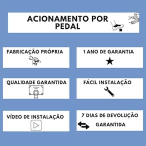 Características: Não necessita de outras conexões para instalação; Pressão de operação: vazão mínima de 7 l/min com 0,2kgf/cm e vazão máxima de 40 l/min com 8,0 kgf/cm; Pedal em aço inox (7cm de largura, 4mm de espessura e 10cm de altura); Diâmetro do cabo: 5mm; Vida útil: mais de 500.000 de acionamentos.