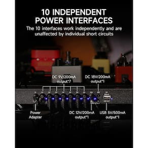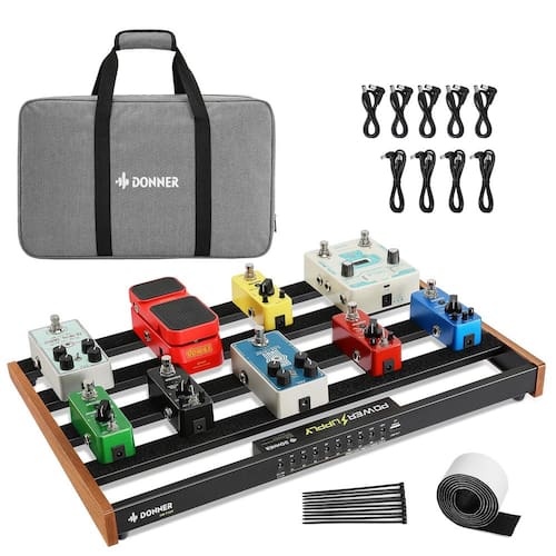 Donner Pedal de guitarra com fonte de alimentação integrada, pedaleira de efeitos de liga de alumínio, DB-P300, 1,5 kg, 50 x 31 x 4,6 cm - ?Fonte de alimentação embutida?O pedalboard alimentado com fonte de alimentação integrada fornece energia limpa e silenciosa para pedais, com cada canal apresentando proteção individual contra curto-circuito, garantindo que não haja interferência de ruído - ?10 interfaces de energia independentes?A placa de pedal de efeitos de guitarra Donner possui 7 saídas de 9 V, juntamente com opções independentes de 12 V e 18 V 200 mA, fornecendo energia para vários tipos de pedais. Uma porta USB adicional de 5 V 500 mA está disponível para carregar seu telefone - ?Liga de alumínio leve e resistente?A placa de pedal grande Donner é feita de liga de alumínio de alta qualidade, oferecendo estabilidade e durabilidade sem deformação. Pesando apenas 1,5 kg e medindo 50 x 31 x 4,5 cm, pode acomodar de 8 a 10 pedais de guitarra. Ideal para apresentações, ensaios ou sessões de estúdio - ?Textura de madeira?O grão de madeira melhora a estética geral do produto, dando uma sensação de alta qualidade. O design angular do pedalboard Donner é ergonomicamente trabalhado para melhorar o conforto - ?Kit funcional? Inclui uma mochila resistente, 1 plugue adaptador, 8 cabos, 2 fitas de gancho e laço e 10 abraçadeiras. A bolsa tem capacidade suficiente para caber no pedalboard e nos pedais