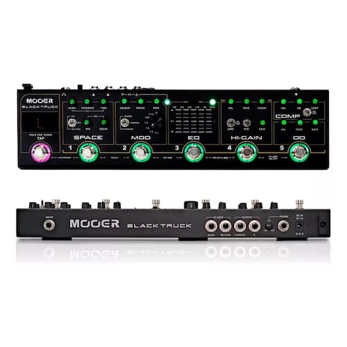 Pedaleira Mooer Black Truck, 6 módulos de efeito, loop de efeitos e afinador embutidos, modos preset e stompbox, saída emulada de falante, leds indicadores de funcionamento.