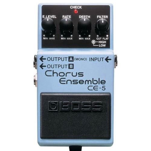 O pedal Chorus CE-5 cobre uma ampla faixa de ajustes, pois contem filtros de corte de frequencias altas e baixas. Cria qualquer tipo de efeito de chorus, do natural e suave, ate o mais espacial e penetrante efeito de chorus estereo, muito popular na musica opopo atual.