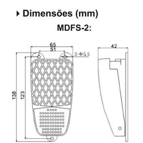 Aplicações: Comando e controle de máquinas e equipamentos. Disponível em diversas versões e característicaspara atender sua aplicação. Modelo sem proteção para os pés e com base antiderrapante. Dados Técnicos: Marca: JNG Modelo: MDFS-2 Material: Metálico Grau de Proteção: IP65 Contatos: 1NA+1NF (reversível) Corrente: 10A Tensão: 250Vca Temperatura Ambiente: -10ºC ~ +60ºC Durabilidade Elétrica: 50.000.000 ciclos Durabilidade Mecânica: 1.000.000 ciclos Prensa Cabo: Entrada sem prensa cabo