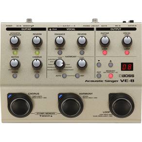 Solução completa para cantores que tocam violão Para cantores e compositores que tocam violão, o mundo está cheio de competitividade. O VE 8 Acoustic Singer oferece aquele toque extra que você precisa para se destacar e brilhar, ajudando com o som BOSS cada vez que se apresentar. Simples de usar, o VE 8 oferece alta qualidade de estúdio ao processamento de voz e violão, além de impressionantes harmonias e loops em tempo real, em uma unidade compacta e portátil. Com grande capacidade sonora e recursos poderosos e criativos, a casa vai cair toda vez que você se apresentar. Solução compacta com pré amp e efeitos para auxiliar cantores que tocam violão Acione o rico e sofisticado processamento de som BOSS com controles simples e intuitivos Processamento vocal de alta qualidade que inclui quatro tipos de efeitos de ambiência, além de Enhance, Pitch correction cromático para afinação vocal em tempo real, e mais Cria harmonizações vocais naturais em tempo real, baseadas no sinal do violão ou configuração manual Também inclui efeito de dobra de voz, além processamentos mais difíceis, como vozes eletrônicas meticulosamente afinadas, distorção e efeito de voz para rádio Canal dedicado para violão inclui Acoustic Resonance, reverb, chorus, afinador e vários efeitos, além de inversor de fase e notch filter para controle feedback Função looper com 80 segundos de gravação e capacidade para loop independente de violão e voz Modo de memória para armazenar e carregar 50 configurações favoritas Conectividade flexível para integrar com um PA principal e monitores de palco, além de USB para gravação no computador Alimentado com seis pilhas AA ou adaptador AC incluso Nível de Entrada Nominal MIC IN menos 40 dBu MIC Sens Center Guitar IN menos 10 dBu AUX IN menos 20 dBu Impedância de Entrada MIC IN 4 k ohms Guitar IN 20 M ohms AUX IN 18 k ohms Nível de Entrada Nominal LINE Out L barra MONO, R menos 10 dBu XLR Out L, R menos 10 dBu Vocal e Guitar, Guitar, menos 40 dBu Vocal Impedância de Saída LINE Out L Mono, R 1 k ohm XLR Out L, R 600 ohms Phones 44 ohms Modo Manual Memory Memory change e stomp Número de Memórias 50 Efeitos Parte vocal Enhance Pitch Correct Harmony barra FX High, Higher, High e Higher, Low, High e Low, Double, Radio, Dist, Eletric Reverb 3 Band EQ, Low Cut Parte Violão Acoustic Resonance Chorus barra FX Chorus, Tremolo, Phaser, Delay, Mod Delay, Octave, Slow Gear, Ring Mod Reverb 3 Band EQ, Low Cut Notch Filter, Phase Phrase Loop 80 seg Tela 7 segmentos, 2 dígitos LED Conectores Conector MIC IN tipo XLR, balanceado, power DC 48 V, 10 mA Max Jack Guitar IN tipo fone de 1 barra 4 polegada Jack AUX IN miniestéreo tipo fone Conectores XLR Out L, R tipo XLR Jacks LINE Oout L barra MONO, R tipo fone 1 barra 4 polegada Jack Phones miniestéreo tipo fone Jack Memory INC barra DEC em TRS tipo fone de 1 barra 4 polegada Porta USB COomputer USB tipo B Jack DC IN Alimentação Adaptador AC Bateria alcalina AA, LR6 x 6 Corrente 360 mA Expectativa de vida das baterias sob uso contínuo Bateria alcalina Aprox. 4.5 horas power OFF, Aprox. 2.5 horas power ON Estes valores podem variar conforme as condições reais de uso. Acessórios Manual do proprietário Folheto Uso seguro da unidade Adaptador AC