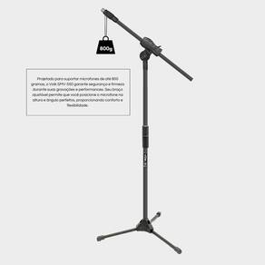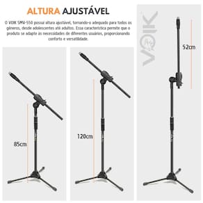 Especificações • Marca: Voik • Modelo: SMV-550 • Cor: Preto • Peso Suportado: 800g • Material: Tubos de aço com pintura eletrostática e peças de plástico injetado de alta resistência nas juntas e articulações • Sistema de Gatilho rápido na haste • Medida da rosca: 5/8" • Altura máxima: 165cm • Altura mínima: 85cm • Comprimento da haste 52cm • Peso do produto: 1,3kg