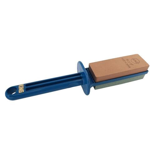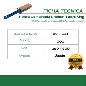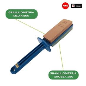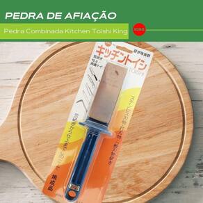 Pedra combinada kitchen toishi King - 250/granulo grosso e 800/granulo médio. Fabricadas no Japão, as pedras king são reconhecidas mundialmente pela alta qualidade, rendimento e durabilidade para afiação e polimento de láminas. Desenvolvida para atender as mais variadas necessidades domésticas, é leve, compacta e extremamente versátil, podendo ser utilizada para afiação de facas, utensílios domésticos, ferramentas e etc. São produtos que atendem os mais exigentes profissionais quando o assunto é afiação e polimento de facas e ferramentas em aço de qualidade. Com as pedras king você corrige e recupera o fio de suas facas e ferramentas, desgastando o minimo de aço. Marcas que investem em qualidade de aço como Tojiro, Global, Iwood, Okatsune entre outros, recomendam King para manutençâo de seus produtos. A King oferece uma sequencia de pedras que atendem aos diferentes estágios no processo de afiação e polimento: Pedras de númeração de 80 à 400 são formadas com um material de granulometria alta granulo grosso , usadas no etágio de reparação e correção das lâminas. As de númeração de 700 à 1200 com uma granulométria média granulo médio , são usadas na afiação propriamente dita, neste estágio se difine a nitidez do fio. Por fim as de númeração 3000 à 8000 granulométria baixa granulo fino , para acabamento, correção de minisculas fraturas do fio e polimento. Modo de uso: Mergulhe a pedra em água limpa por cerca de 3 minutos, não é necessario mergulhar em água as láminas que deseja de afiar, e utiliza-lá para realizar a afiação. Para realizar o acabamento de sua lámina basta afiar levemente a parte de trás da mesma, de 2-3 vezes para remover a rebarba. Importante: Facas de dois gumes é necessario afiar o mesmo número de vezes os dois lados. Também caso seja realizado o processo de afiação com diversas facas é necessario mergulhar a pedra em água a cada afiação para remover as particulas deixadas na pedra. Caracteristicas: Afiador Kitchen Toishi Dimensões: 20x5x4cm Peso: 200g Grid: 250 granulo grosso / 800 granulo médio Material ada base: plástico Fabricante: King Origem: Japão
