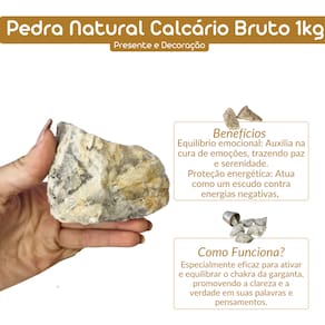 O Calcário Bruto – 1 kg O Calcário Bruto é uma pedra de estabilidade e fortalecimento, conhecida por sua energia de equilíbrio e conexão com a terra. Com 1 kg, essa rocha natural representa a base sólida da vida, trazendo firmeza espiritual e proteção contra inconstâncias. Acredita-se que o calcário ajuda a criar alicerces fortes, tanto no mundo físico quanto no espiritual, sendo ideal para quem busca segurança, grounding e harmonia no ambiente. Seu toque rústico reforça sua autenticidade, tornando-o uma peça especial para quem valoriza a energia das pedras naturais. Observações Importantes: Por ser uma pedra natural, o Calcário Bruto pode apresentar variações nas cores, tamanhos, formatos e peso das pedras. No entanto, garantimos que todas as pedras são cuidadosamente selecionadas por nossos especialistas para oferecer a melhor qualidade e pureza possíveis. Qualidade Garantida: As pedras são selecionadas especialmente para colecionadores e entusiastas de cristais. Enviamos o seu pedido em até 24 horas úteis após a confirmação do pagamento! Caso tenha alguma dúvida, nos envie uma mensagem e responderemos rapidamente para te ajudar da melhor forma possível. Marca: Meta Atacado