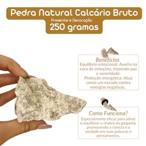 Pedra Natural Calcário Bruto – 250g O Calcário é uma rocha sedimentar amplamente utilizada devido às suas propriedades naturais e versatilidade. No formato bruto, é ideal para estudos geológicos, colecionadores de minerais e aplicações diversas na indústria e artesanato. Benefícios do Calcário\nEquilíbrio energético: Associado à estabilidade e à conexão com a natureza.\nUso educativo e científico: Muito utilizado em pesquisas e estudos geológicos.\nAplicação variada: Pode ser utilizado na jardinagem, artesanato e decorações rústicas.\nObservações Importantes\nPor ser uma pedra natural, pode apresentar variações em cor, formato e textura.\nO peso aproximado da peça é de 250g, respeitando suas características naturais.\nTodas as pedras são cuidadosamente selecionadas para garantir a melhor qualidade.\nQualidade Garantida As pedras são escolhidas especialmente para colecionadores e entusiastas de minerais. Enviamos a sua encomenda em até 24 horas após a confirmação do pagamento! Caso tenha alguma dúvida, nos envie uma mensagem e responderemos rapidamente para te ajudar da melhor forma possível. Marca: Meta Atacado