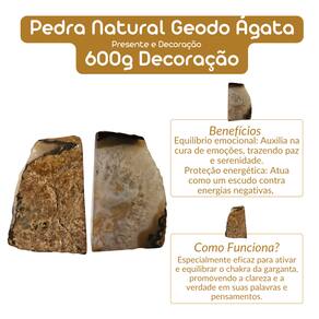 Pedra Natural Geodo Ágata – 600g O Geodo de Ágata é uma peça natural impressionante, formada ao longo de milhares de anos. Seu interior cristalizado proporciona uma beleza única e energias harmonizadoras, sendo ideal para decoração, meditação e equilíbrio energético. Benefícios da Ágata\nHarmonia e equilíbrio: Auxilia na estabilização das emoções e na da paz interior.\nProteção energética: Atua como um escudo contra energias negativas, proporcionando segurança e bem-estar.\nBeleza natural: Seu formato geodo destaca cristais internos, tornando cada peça única para decoração e espiritualidade.\nObservações Importantes\nPor ser uma pedra natural, pode apresentar variações em cor, formato e textura.\nO peso aproximado da peça é de 600g, respeitando as características naturais do mineral.\nTodas as pedras são cuidadosamente selecionadas para garantir a melhor qualidade.\nQualidade Garantida As pedras são escolhidas especialmente para colecionadores e entusiastas de cristais. Enviamos a sua encomenda em até 24 horas após a confirmação do pagamento! Caso tenha alguma dúvida, nos envie uma mensagem e responderemos rapidamente para te ajudar da melhor forma possível. Marca: Meta venda em lote
