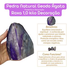 Pedra Natural Geodo Ágata Roxa – 1,0 kg O Geodo de Ágata Roxa é uma peça natural única, formada ao longo de milhares de anos. Seu interior cristalizado exibe tons vibrantes de roxo, tornando-se uma excelente opção para decoração, meditação e energização de ambientes. Benefícios da Ágata Roxa