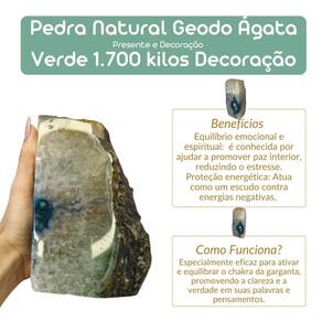 Pedra Natural Geodo Ágata Verde 1,7 Kg Decoração Pedra Natural Geodo Ágata Verde - 1,700 kg O Geodo de Ágata Verde é uma peça natural fascinante, formada ao longo de milhares de anos. Seu interior cristalizado em tons vibrantes de verde proporciona um visual único, sendo ideal para decoração, meditação e energização de ambientes. Benefícios da Ágata Verde