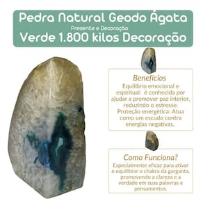 Pedra Natural Geodo Ágata Verde 1,8 Kg Decoração Pedra Natural Geodo Ágata Verde - 1,800 kg O Geodo de Ágata Verde é uma peça natural única, formada ao longo de milhares de anos. Seu interior cristalizado em tons vibrantes de verde proporciona um visual impressionante, sendo perfeito para decoração, energização de ambientes e práticas espirituais. Benefícios da Ágata Verde