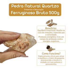 Pedra Natural Quartzo Ferruginoso Bruto – 500g O Quartzo Ferruginoso é uma pedra natural que combina a força do quartzo com a energia do ferro, tornando-se uma poderosa fonte de vitalidade, proteção e equilíbrio. No formato bruto, mantém sua energia intensa e autêntica, sendo ideal para colecionadores, terapeutas e entusiastas de cristais. Benefícios do Quartzo Ferruginoso
