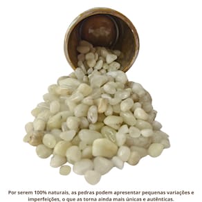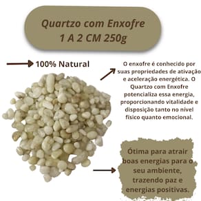 Observações Importantes: Por ser uma pedra natural, o Quartzo com Enxofre pode apresentar variações nas cores, tamanhos, formatos e peso das pedras. No entanto, garantimos que todas as pedras são cuidadosamente por nossos especialistas para oferecer a melhor qualidade e pureza possíveis. As pedras incluídas no pacote possuem tamanhos variando entre 1 e 2 cm. Para garantir o peso de 250g, o pacote será composto predominantemente por pedras de Quartzo com Enxofre de excelente qualidade, podendo conter também pedras de outros tipos de Quartzo ou cristais de qualidade similar, assegurando o peso anunciado. Qualidade Garantida: As pedras são polidas e selecionadas especialmente para colecionadores e entusiastas de cristais.