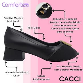 Esse sapato feminino estilo peeptoe da Comfortflex foi desenvolvido para oferecer estilo com total conforto. Seu design moderno traz um cabedal em material de alta qualidade com acabamento brilhante e aplicação de malha ajustável, que se molda suavemente aos pés, especialmente na região do joanete. O detalhe metalizado na parte frontal acrescenta um toque refinado ao visual.