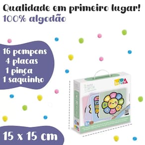 Incluso no kit: 16 pompons coloridos e macios. 4 placas de madeira ilustradas 14 x 14 cm . 1 pinça de madeira, fácil de manusear por mãos pequenas. 1 bolsa prática para transportar o jogo com facilidade.