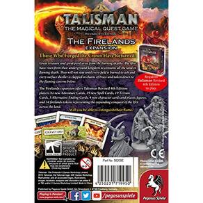 Aqueles que forjaram a Coroa voltaram! Grande tesouro e grande perigo surgem das profundezas ardentes. Os Ifrit ressuscitaram de seu reino subterrâneo para consumir toda a terra em chamas. Eles não vão parar até que cada campo seja queimado em cinzas e cada morador da superfície é aplaudido em correntes de latão e levado para as cavernas em chamas abaixo. A expansão firelands oferece aos jogadores da Talisman Revised 4th Edition 81 novos Cartões de Aventura, 19 novas Cartas Spell, 19 Cartas de Terreno, 3 Cartões finais alternativos, 4 novos cartões de caracteres e figuras plásticas, e 34 tokens firelands representando a crescente conquista do Ifrit em todo o país. Os heróis serão capazes de apagar sua chama?