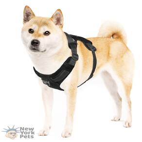 Este arnês para cães apresenta material reflexivo para aumentar a visibilidade, bem como um crachá para informações de contato de emergência do animal de estimação e do proprietário. Disponível em vários tamanhos.