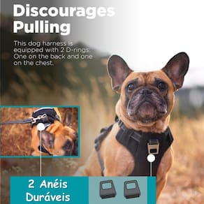É também um arnês para cães com bolsos e compartimento para saco de lixo! Dois bolsos com zíper permitem que você guarde qualquer coisa, desde sacos de cocô até guloseimas para cães e chaves de casa. Há uma argola em D nas costas para quando você precisar proteger seu cão rapidamente e uma argola em D no peito frontal para prender a guia e desencorajar puxões.