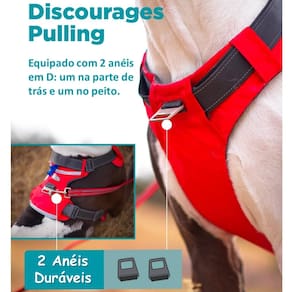 Há uma argola em D nas costas para quando você precisar proteger seu cão rapidamente e uma argola em D no peito frontal para prender a guia e desencorajar puxões.