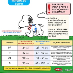 Peitoral para corpo Snoopy XaBlue Zooz Pets PEITORAL DE CORPO Feito com a última tecnologia de impressão, as Peitorais, e todos os acessórios Zooz Pets tem um design marcante, divertido e com super nitídez do personagem Snoopy. Com múltiplas camadas super resistentes de polyester tetoron, além de ter diversos ajuste para melhor encaixar no seu pet, além de ter duas argolas para encaixar a guia e ter maior proteção.