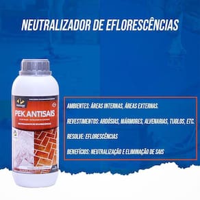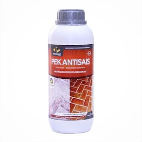 Pek Antisais é uma solução aquosa para o tratamento de eflorescências danosas ao cimento e aos revestimentos em geral. Aplicando-o sobre a superfície é possível neutralizar os efeitos da corrosão, transformando os sais solúveis causadores das manchas brancas em insolúveis e/ou dificilmente solúveis.Ambientes: Áreas internas, Áreas externas.Revestimentos: Ardósias, Mármores, Alvenarias, Tijolos, etc.Resolve: EflorescênciasBenefícios: Neutralização e eliminação de saisApresentação: 1L