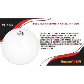 Pele de resposta caixa 14' uno us14h30 Todos produtos são com e do fabricante - todos produtos são testados antes do envio - regulagem em instrumentos de corda são cortesia, não se aplicam bem como encordoamentos arrebentados não são cobertos na - cores dos produtos podem ter variação da foto para o produto real, principalmente violões em que as madeira tem variações de cor e veios da madeira. Descrição do produto: A uno hazy 300 é a pele de resposta para caixa mais versátil da evans. Seu filme de 30 mil 0,075mm de espessura oferece uma ampla variedade de dinâmicas e controle da resposta da esteira em todos os níveis de dinâmicas. As peles uno são presas de forma plissada em um anel de alta qualidade. Prazos de troca e devolução: - o consumidor tem direto a troca ou devolução do produto com defeito dentro de 7 dias corridos, apos esse prazo é acionada a do fabricante - devoluções por arrependimento deve serm feitas com embalagem, todos itens que acompanham produto, e não deve haver havarias no produto, marcas de uso etc. Por isso tenha certeza do produto que está comprando o prazo para devoluçoes é de 7 dias Ean: 019954958787