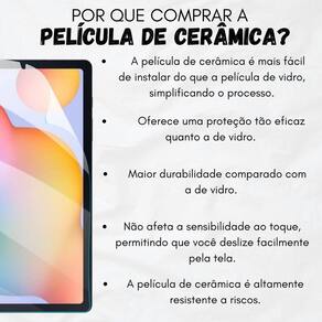por que devo escolher uma película de cerâmica para o meu tablet R: a película de cerâmica oferece uma proteção avançada contra arranhões, mantendo a tela do seu tablet livre de danos e preservando sua clareza de imagem. como a película de cerâmica contribui para a longevidade do tablet R: graças à sua resistência avançada a arranhões e impactos leves, a película de cerâmica ajuda a proteger a tela do tablet, prolongando sua vida útil e evitando danos indesejados.
