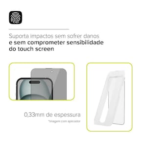 Especificações Película de vidro temperado ansparente com borda Filtro polarizador que limita a visão lateral da tela Matéria-prima japonesa (Asahi Glass) Espessura de 0,33mm Protege a tela contra riscos e pequenas batidas Não afeta a sensibilidade da tela