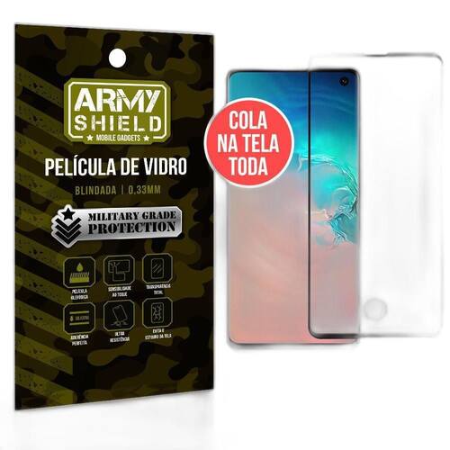 Película De Vidro Elite Cola Na Tela Toda Samsung Galaxy S10 - Armyshield Película de Vidro Elite Cola na Tela Toda - Armyshield A Película de Vidro Elite Armyshield é ideal para você quer dar uma cara nova para o seu smartphone sem abrir mão do estilo e da proteção. Ela cobre a toda a parte frontal do aparelho e adere na tela toda. Com exclusivo corte para o reconhecimento de digital do Galaxy S10 Cobre 100% da tela. Adere em 100% da tela. Nível de dureza 9H. Transparência luminosa 99. 99%. Feita em Vidro Temperado. Camada oleofóbica. Espessura de 0. 33mm. Antichoque. Aderência por eletrostática no centro. Aderência por cola na tela toda. Pode não ser Serve Para com algumas capas. Proteção contra quedas, riscos e arranhões. Acompanha pano para limpeza da tela. Proteção para o seu smartphone é Armyshield!