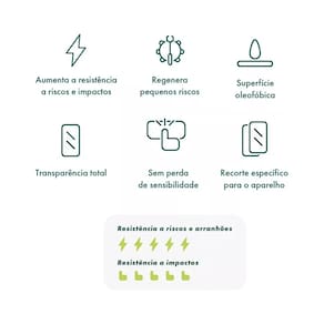 Tecnologia NanoShield com camada de auto reparo, resistente a riscos e impactos. Não quebra ao receber fortes impactos. Tecnologia Electra-SAT sem uso de cola. Não interfere no Touch. Superfície Oleofóbica. Produzida em Poliuretano. Versão reduzida para uso com capa.Tipo