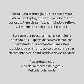 Essa película possui a mesma tecnologia aplicada nos displays de caixas eletrônicos, permitindo que somente quem esteja posicionado em frente ao celular consiga ver claramente o que está sendo exibido no visor.