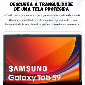 Película protetora vidro temperado full para samsung tab s9 cor: transparente a película é um item muito importante a se usar no seu dispositivo, pois a película é responsável por proteger o seu aparelho de possíveis danos como riscos, quedas, além de ser altamente resistente. A película é elaborada de vidro temperado, tem a sua transparência totalmente cristalina, não perde sensibilidade ao toque, fixação por estática, sendo super fácil de aplicar e remove-la, sem afetar a tela do dispositivo. É extremamente segura. Caso a película seja quebrada, as partículas formadas não são afiadas e ficam aderidas à camada adesiva de silicone, tornando-o muito mais seguro que as outras películas. --------------- atenção --------------- compatível com galaxy tab s9 11 polegadas 2023 . Modo de uso: 1- a instalação é super fácil, basta alinhar a película com a tela do tablet, que deverá ser previamente limpa, enviaremos um kit de limpeza, e dar uma pequena pressão no centro da película para que a adesão seja completa e sem bolhas. Caso tenha dificuldade você pode nos enviar mensagem no chat da compra que iremos enviar um video auxiliando na aplicação. ---------------------------------------- ---------------------------------------- é compatível com o samsung tab s9 11 polegadas 2023 r: sim. A película é específica para esse modelo e servirá perfeitamente. É compatível com o samsung tab s9 ultra / tab s9 plus 2023 r: não. A película não é compatível com esse modelo. Posso usar a capa com película a capa não levanta a película r: sim, é possível usar a capa com a película. A capa possui recortes precisos ao qual não levanta a película. -------------------- especificações: -------------------- material: vidro temperado. Peso: 15g. Compatível com samsung tab s9 11 2023 / s8 11 x706 x700 2022 / tab s7 11 t870 t875 2020 . Contéudo: 1x película vidro temperado. 1x limpa telas. Atenção: aanúncio referente somente a película tablet não incluso