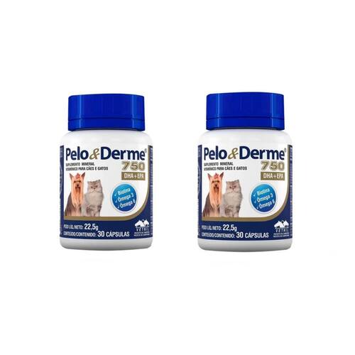 - Elaborado com biotina, zinco, vitamina A e vitamina E;- Com ômega 3 Ácido Eicosapentaenóico e Ácido Docosahexaenóico ;- Ômega 6 Ácido Linoleico , vitaminas e minerais;- Trata de dentro para fora a derme e pelos de cachorros e gatos;- Indicado para o fortalecimento e manutenção da estrutura da pele.O Suplemento Vetnil Pelo & Derme DHA + EPA 750 foi desenvolvido através de uma fórmula revolucionaria, equilibrada e muito moderna. Contém os principais ácidos graxos essenciais à dieta dos animais. Os ingrediente reunidos atuam de forma a manter as características morfológicas, plásticas e funcionais da pelagem e da pele. Vida longa e saudável ao seu animal.Administrar via oral.Pelo & Derme 750:1 cápsula ao dia para animais até 10 kg de peso, durante 4 a 8 semanas, diretamente na boca, ou misturadas aos alimentos.