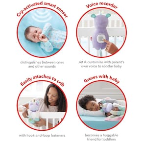 ESPECIFICAÇÕES: Idade indicativa: 0 meses+; O sensor inteligente ativado pelo choro distingue entre gritos e outros sons; Responde automaticamente ao choro do bebê; Toca 3 canções de ninar e 3 sons suaves; Ruído branco, ajuda a criar uma atmosfera de silêncio, faz com que o bebê adormeça mais rápido; O gravador de voz permite que os pais acalmem o bebê com a voz; Até 20 minutos contínuo; Módulo de som removível, fácil de configurar e personalizar; Fixa-se facilmente ao berço com fechos de tiras duplas aderentes; Cresce com o bebê: torna-se um amigo que pode ser abraçado por crianças pequenas; Requer 3 pilhas AA inclusas .
