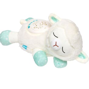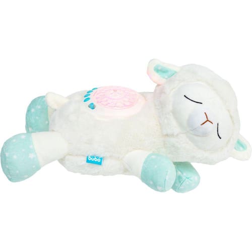 O Carneirinho da Buba vem com um dispositivo de efeitos luminosos e sonoros. Aperte os botões para ouvir canções de ninar e ligar o refletor que exibe imagens relaxantes como de um céu estrelado em plena parede do quarto! É a companhia perfeita para a hora do soninho