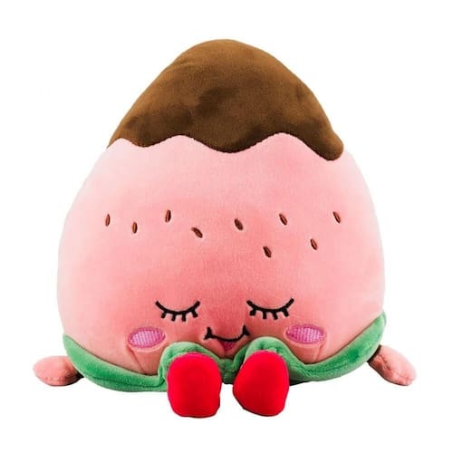 Pelúcia Morango Com Chocolate Rosto Feliz Fofo 20cm Pelúcia no formato de um morango na cor rosa coberto de chocolate no topo com 20 cm de altura. Moranguinho de pelúcia tem um rosto de olhos fechados e pezinhos soltos. Material: poliéster; Enchimento: fibra de poliéster; Produto certificado por Órgão acreditado pela CGCRE do INMETRO Ean: 7899806221091