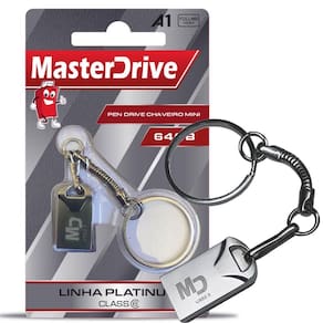 Mini Pendrive 64GB Tipo Chaveiro - Linha Platinum MasterDrive Compre agora o seu Mini Pendrive 64GB tipo chaveiro e tenha o melhor desempenho, durabilidade e segurança que um pendrive de 64GB pode oferecer - Alta Velocidade e Qualidade Moderno Pendrive 64GB MasterDrive LINHA PLATINUM, com qualidade incomparável e acabamento de primeiríssima qualidade que pode ser Utilizado como chaveiro. Especificações: - Modelo: Mini Chaveiro - Capacidade: 64GB - Linha: Platinum - Classe: 6 - Material: Alumínio - Conexão: USB 2.0 - Marca: MasterDrive Ean: 7893826850019