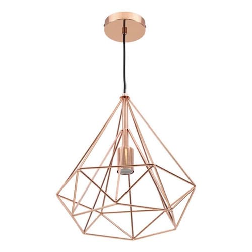 Design moderno e industrial, com estrutura aramada em metal; Cor cobre, que adiciona um toque de sofisticacao e aconchego; Ideal para uso em diversos ambientes, como salas de jantar, cozinhas, quartos e areas de estar; Suporta uma lampada com soquete E27 nao inclusa , permitindo a utilizacao de diferentes tipos de lampadas, como LED, incandescente ou fluorescente; Facil instalacao, com sistema de fixacao para teto.