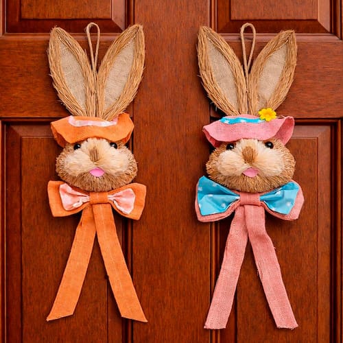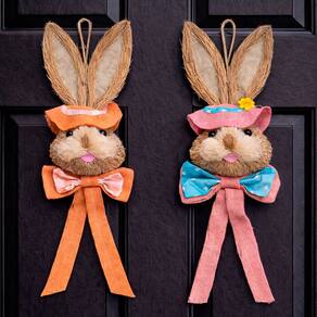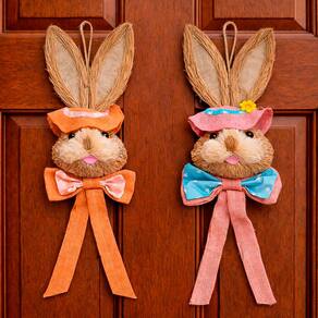 Deixe sua decoração de Páscoa ainda mais charmosa com estes lindos pendentes em formato de cabeça de coelho com laço. Produzido em palha, traz um visual rústico e delicado que combina perfeitamente com decorações naturais, clássicas ou modernas