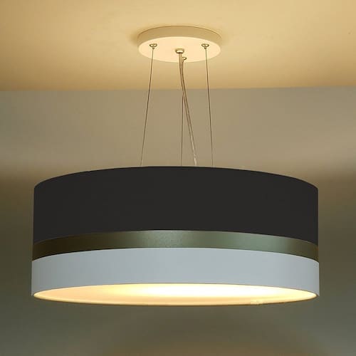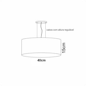 O pendente é indicado para ambientes internos e pode ser instalados em salas de estar ou jantar, quartos, escritórios, etc. Além de atribuir maior personalidade ao ambiente esse modelo também propicia um espaço mais acolhedor por meio da sua iluminação delicada e difusa. Acabamento: PET Flexível Acompanha Cúpula: Sim Acompanha Lâmpada: Não Altura: 15 Altura Regulável: Sim Ambiente de Iluminação: Interno Ambiente Principal: Sala de Jantar Complexidade da Montagem: Baixa: pode ser montado por uma pessoa sozinha Comprimento: 40 Comprimento do Cabo: 120 Cor: Preto /Bronze/Branco Cor do Acabamento: Preto Cor do Produto: Preto /Bronze/Branco Cor Predominante: Preto Diâmetro: 40 Formato: Cilindrico Largura: 40 Linha ou Coleção: Faixa Dupla Material da Cúpula: PSAI de Alto Impacto Material Principal: Tecido Medida da Canopla (A x D): 0,5x12cm Medida da Cúpula (A x D): 15x40 Necessita Montagem: Não Origem do Produto: Nacional Peso: 1.18 Possui Braços: Não Possui Cristal: Não Potência: 15 Potência Máxima da Lâmpada: 15 W Profundidade: 40 Quantidade de Itens: 1 Quantidade de Lâmpadas: 2 Soquete: E-27 Tipo de Luminária: Pendente Voltagem: Bivolt Ean: 7899679218358