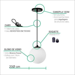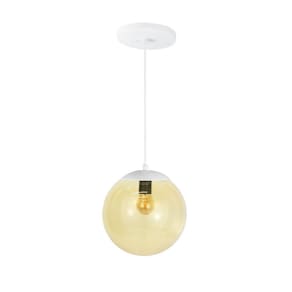 Inspirado no Design Vintage o pendente Globo transmite uma decoração sofisticada e dá um toque divertido ao espaço. Seu design minimalista com esfera de vidro tira qualquer sala da . Uma peça diferenciada e muito elegante que fará toda a diferença no seu ambiente. Ideal para iluminações de centro de mesa, balcões, mesa de jogos entre outros. Descrição Técnica: - Modelo: GLOBO 20cm - Acabamento do Vidro: ÂMBAR - Acabamento da Base: BRANCO - Quantidade de soquetes: 1 - Material: Vidro e Alumínio - Tamanho do Globo (LxAxP): 20cm x 20cm x 20cm - Cabo Revestido em tecido: 1m (regulável) - Soquete: E27 - Bivolt: Sim - Canopla: Em metal com regulador ****
