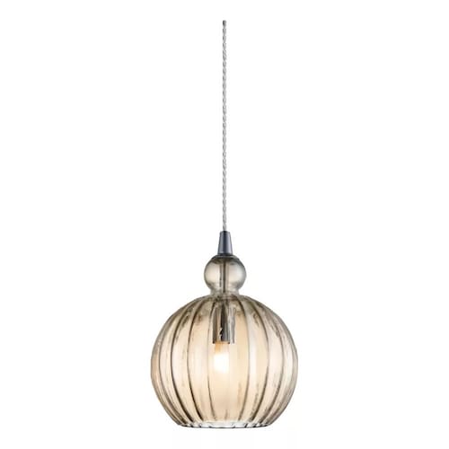 Cód: PE-054/1.15CO Pendente Kristy Conhaque Soquete: 1*E27 (Lâmpada não inclusa) Material: Vidro e Aço Cor: Conhaque e Cromado Dimensões: Ø15x21cm Canopla: Ø12cm Comprimento do Cabo: 150cm