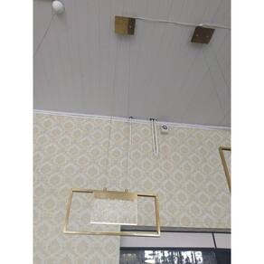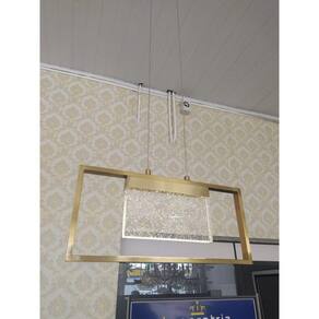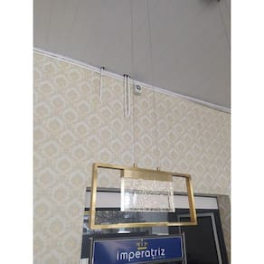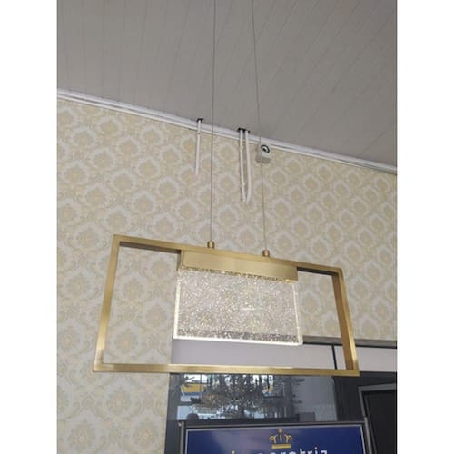 Pendente Retangular em Metal dourado e cristal com bolhas. Potencia 6w em led luz 4000k(neutra). Comprimento 40 cm, altura 18 cm mais cordão com altura ajustável.