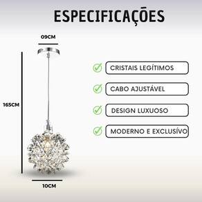- Todos os pedidos aprovados até as 13:00 serão enviados no mesmo dia!Tendencia decorativa para 2023, essa luminária moderna e contemporânea oferece um design luxuoso único, sendo indicado pelos arquitetos para ambientes comerciais e residenciais.________________________________________CARACTERÍSTICAS• Cor: Cromado/Prata• Voltagem: Bivolt 110V/220V• Material: Metal e Cristal• Acabamento: Brilhante• Tipo de iluminação: Utiliza 1 lâmpada G9 (Não inclusa)• Fluxo Luminoso: 1.800 Lúmens• Potência: 20W• Dimensão Total: 165cm (Cabo + Lustre)• MEDIDA DETALHADA:• da lustre: 10cm de largura x 10cm de profundidade x 15cm de altura.• da Canopla ou Base: 09cm de diâmetro• do Cabo: 150cm (ajustável)______________________________________ITENS INCLUSOS• 01 Luminária Provençal.