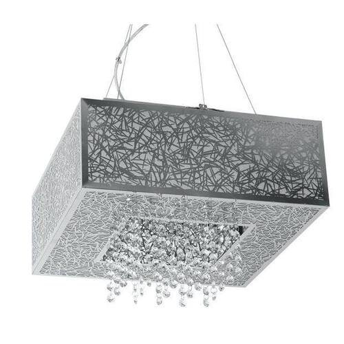 Pendente lustre apolo inox quadrado com cristal para led 60 x 60 cm Pendente lustre apolo em inox cromado, com design arrojado e super moderno pelos cortes retos e pelo desenho recortado a laser na lamina de inox, dentro possui uma película de pvc brilhante que proporciona um efeito claro e aconchegante, luminária leve e fácil de instalar é indicada para salas, quartos, corredores, hall de entrada e escritórios. Seus materiais são pvc, cristal e metal. Comporta 9 lâmpadas de soquete g9 de led com potência de 7w não inclusas . Pendente apolo cromado com cúpula de inox recortado a laser e película de pvc interna brilhante, com cristais. Utiliza 09x led-g9. Não acompanha lâmpadas. Produto semi-montado. Medidas: l 60 - p 60 - a 20 cm. Bivolt.