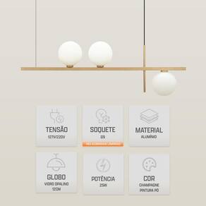 transforme seu ambiente com o pendente pd 6095, um modelo sofisticado que combina design moderno e iluminação eficiente. Seu acabamento em alumínio champagne proporciona um toque elegante e contemporâneo para qualquer espaço. Destaques do produto -com um design moderno e sofisticado - combinando com qualquer decoração e ambiente. -modelo : pd 6095. -cor es : champagne pintura pó . -material de alta qualidade : feita com um alumínio resistente para maior durabilidade. -compatível com lâmpadas led g9 -ideal para diferentes ambientes - perfeita para quartos, salas, escritórios e áreas gourmet. -peça com acionamento em instalado no ambiente. -modelo não recarregável. - de 3 meses. Especificações técnicas Pd 6095 g12 800x320x1500mm 3xg9 cp - op Material : alumínio Globo de vidro 12cm Cor : champagne Cabo de iluminação : 2 mts regulável Base canopla : 120 mm Soquete da luminária : g9 Número de lâmpadas : 3 lâmpadas lâmpada não inclusa Voltagem : 127v - 220v Medida : 800mm x 320mm x 1500mm Quantidade : 1 produtos. Observação : a lâmpada não acompanha o produto. O produto necessita de instalação elétrica para o funcionamento adequado. Conteúdo da embalagem : 1 luminária. Marca: Não Informado Ean: 7893313588081
