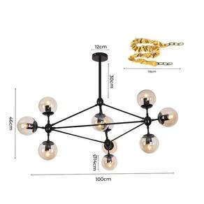 Pendente nordecor jabuticaba 14cm - preto ll3001b - bocal: 10E27 - ip20 - Lustre jabuticaba preto 10xe27 biv nordecor ll3001b família: pendente fabricante: nordecor referência: ll3001b origem: importado fonte de iluminação: lâmpada quantidade de lâmpadas: 10 lâmpada indicada: led filamento soquete: e27 Tensão: bivolt posição: sobrepor no(a) teto ambiente: interno dimensões(cm): (c) 100 x (l) 93 x (a) 43 tamaho do cabo(cm): 150 cor: Alumínio preto e vidro âmbar material: alumínio e vidro esse pendente é pendurado por uma haste preta de 30cm fixada na peça e por uma corrente com cobertura de tecido preta de 1,2m que conecta a haste à canopla de teto. Lâmpada não inclusa