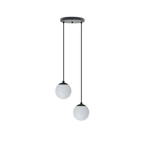Este pendente é feito de alumínio de alta qualidade, garantindo durabilidade e resistência. Possui dois globos de vidro com 13,5cm de diâmetro, proporcionando uma iluminação suave e agradável. O cabo em tecido preto é ajustável na instalação, podendo variar entre 1,25m e 1,50m de altura.