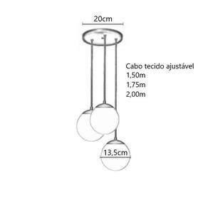 Fabricado em alumínio e vidro, esse pendente possui uma base de 20cm de diâmetro e uma altura ajustável de 2,00m. Seus 3 globos de vidro, com 13,5cm de diâmetro cada, trazem um toque de charme e requinte ao conjunto. O cabo em tecido preto é ajustável na instalação, permitindo que você escolha a altura ideal para o seu ambiente.