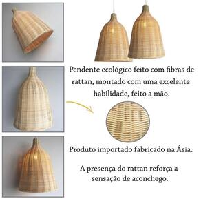Pendente Rattan Em Fibra Natural Vime Artesanal Sala De Estar Nat14 Natural, harmônico e muito elegante, nat14 faz parte da nossa nova linha de pendentes feitos de fibra natural. Esse pendente possui o seu material feito com ratan, incrivelmente montada a mão proporcionando um aconchego e beleza no seu ambiente. O rattan também é muito versátil e se adapta a todos os cômodos da casa, indo bem desde o banheiro até o home office, passando pela cozinha, quartos e espaços nobres como a sala de estar e de jantar. Descrição:- Materiais: Estrutura: Alumínio Difusor: Montado a mão com ratan- Cor: Fio/canopla: Branco Difusor: Ratan Natural- Medidas: Altura do difusor: 42 cm Diâmetro do difusor: 28 cm Comprimento do fio: 140 cm Base ou canopla que fixa no teto: 10 cm Altura da canopla: 2 cm Altura total do pendente: 166 cm- Tensão: 110-220V- Lâmpada: E27 Não acompanha lâmpada.