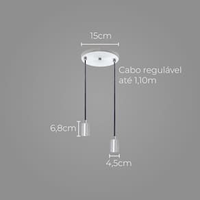 ESPECIFICAÇÕES TÉCNICAS: - Cor: Escovado - Material: Alumínio - Voltagem: Bivolt 110/220V - Soquete: 2x E-27 (lâmpadas não inclusas) - Dimensões Soquete: 6,8 cm de altura x 4,5 cm de diâmetro - Dimensões da Base (teto): 15 cm de diâmetro - Comprimento do Cabo: regulável em até 1,10 m